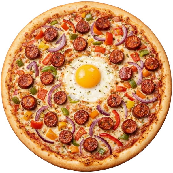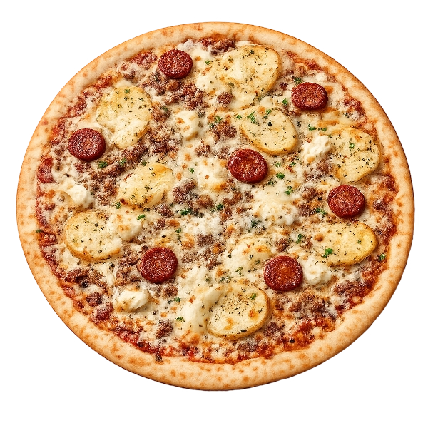 SAUCE TOMATE, FROMAGE, MERGUES, CHORIZO, POIVRONS, OLIVES