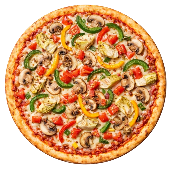 SAUCE TOMATE, FROMAGE, CHAMPIGNONS, POIVRONS TOMATES FRAICHE, ARTICHAUTS